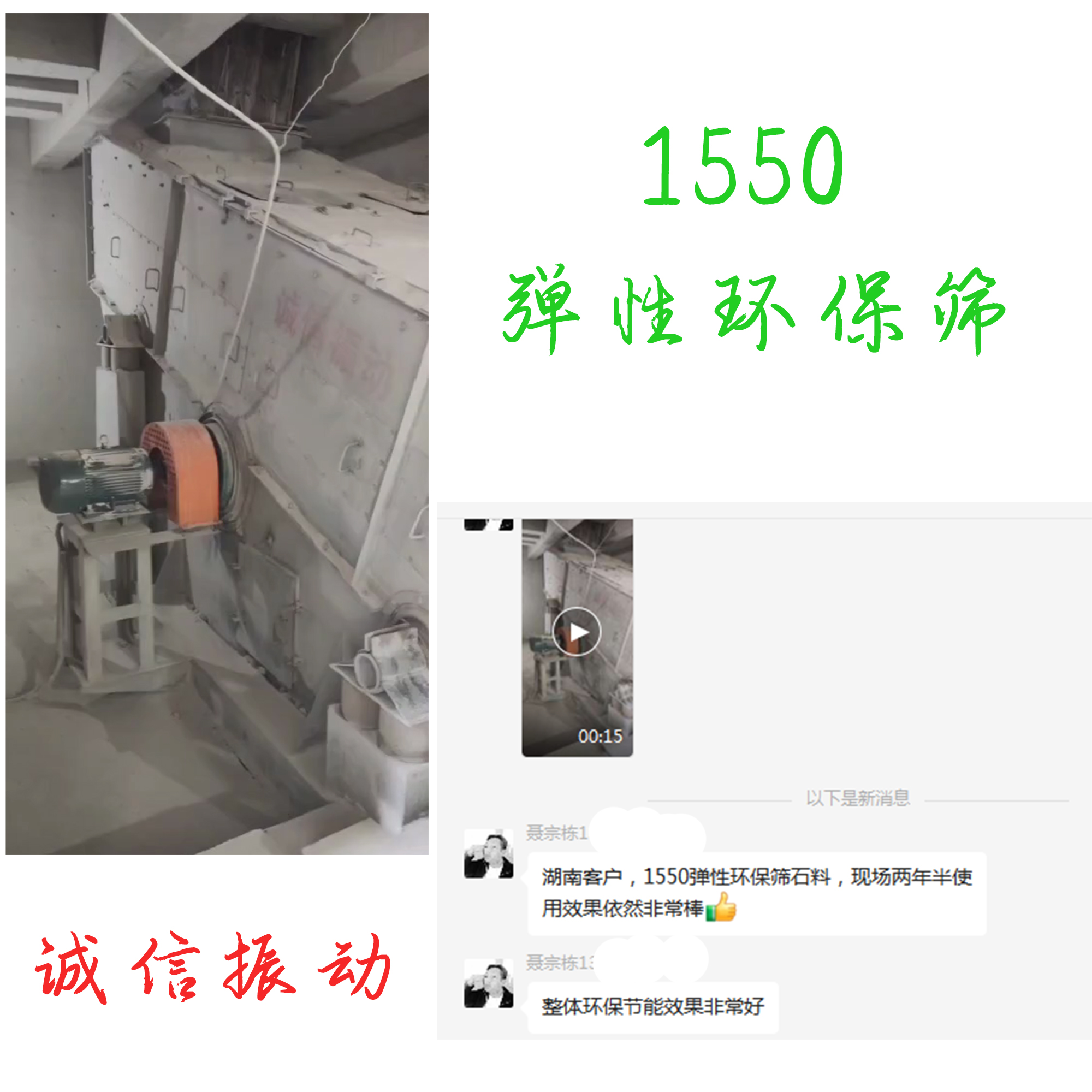 湖南的客戶,1550彈性環保篩 篩石料,現場兩年半使用效果依然非常棒!整體環保節能效果非常好!每每收到客戶這樣的評價,滿心的感動,客戶的認可就是我們前進的動力!